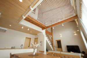 リビングの吹き抜けにはアスレチックネットがあり、ゴロンと転がってひなたぼっこもできる遊び心たっぷりの空間が広がります。