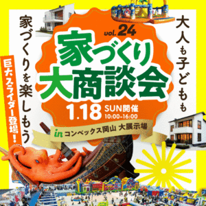 岡山の住宅会社31社が集結する家づくりイベントで、気になる会社の話が1日で聞け、効率良くマイホームの情報をGETできるおすすめのイベントです。