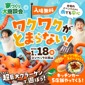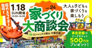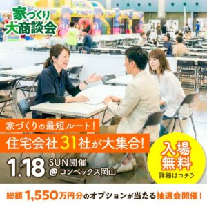 1月18日(日)、岡山のコンベックス岡山にて開催される「家づくり大商談会」に「木の城いちばん」も出展いたします。このイベントは、岡山の住宅会社31社が集結し、理想のマイホームを実現するための情報が満載です。
