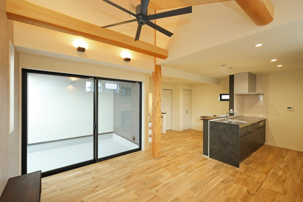 ご夫婦で選ばれた柱や梁が個性的なLDK。小上りの和室から繋がるのはまるで秘密基地のような半地下ホビールーム!