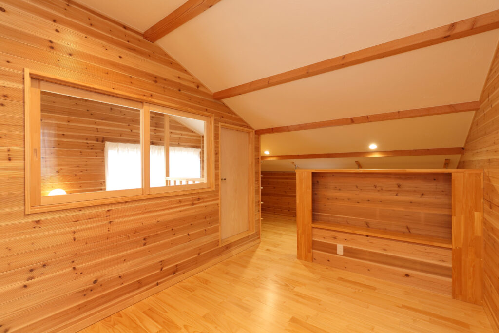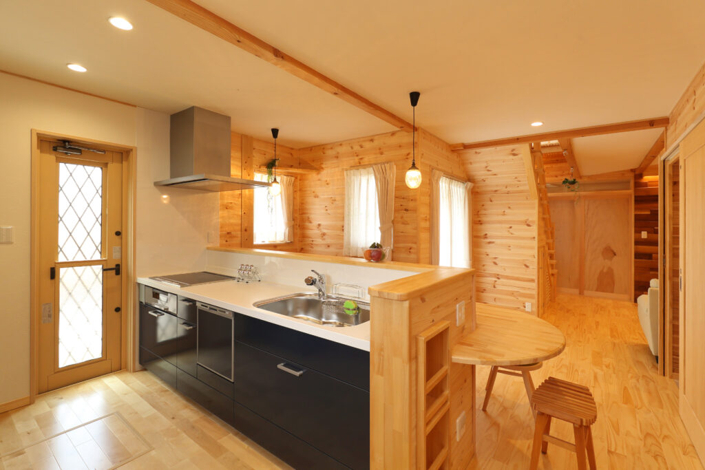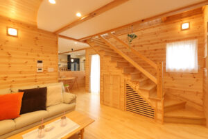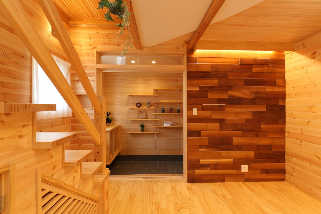 家族の集まるリビングは、床と壁にパイン材、天井は漆喰と檜の羽目板を使用し、自然素材にこだわった身体にやさしく心も身体も落ち着く空間です。