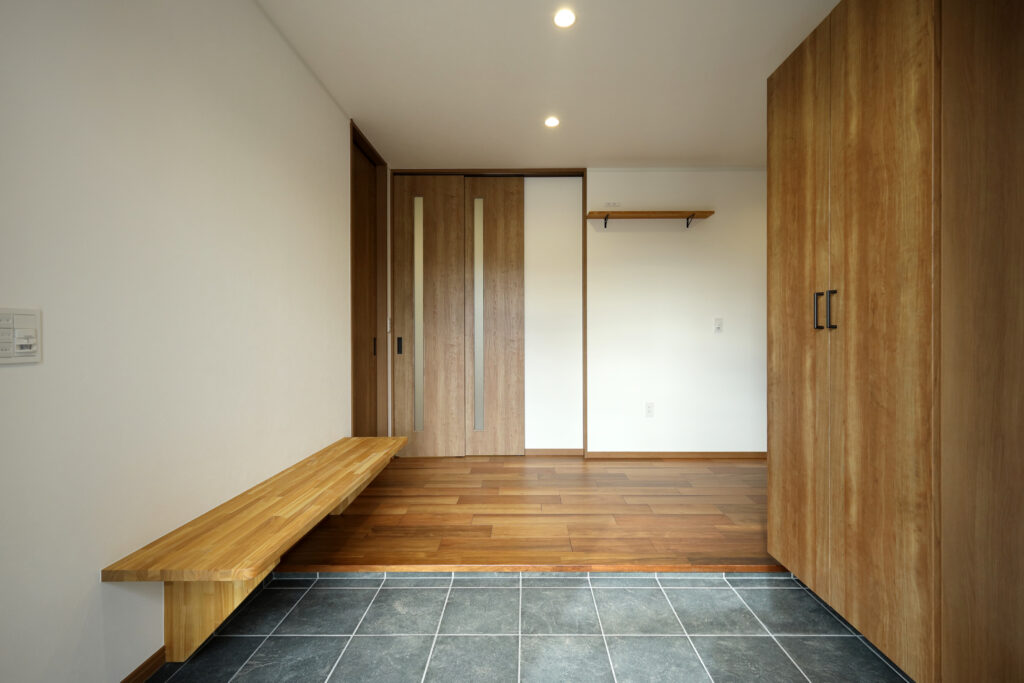 引戸の玄関ドアを開けると、広いホールの壁側にはベンチが設置されており、様々なシーンで重宝します。